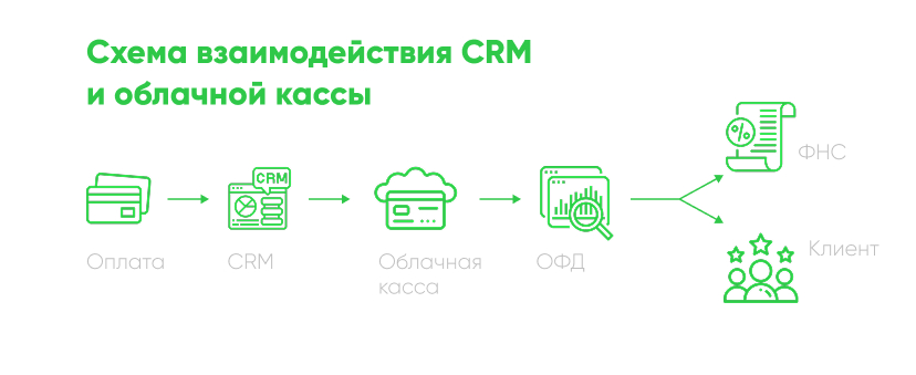 CRM фиксирует факт оплаты по интернет-эквайрингу, который в свою очередь автоматически передаёт данные в облачную кассу.