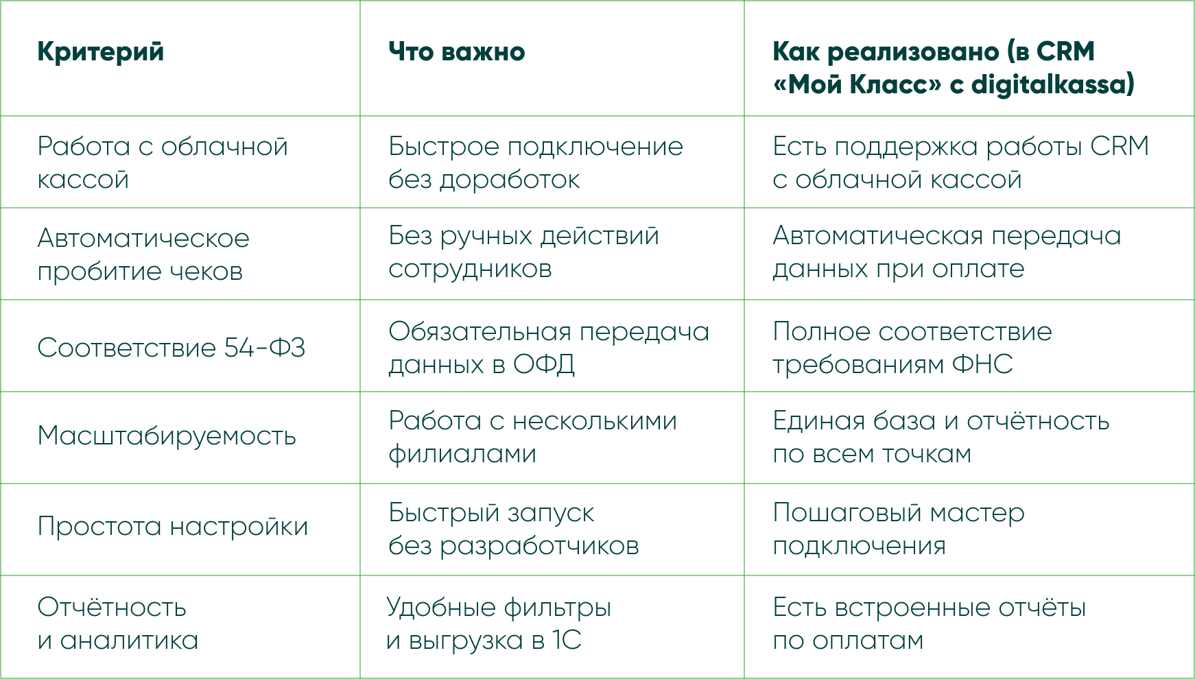 Для удобства, ознакомьтесь с таблицей ниже и сохраните для себя информацию о важных факторах выбора кассы для CRM.