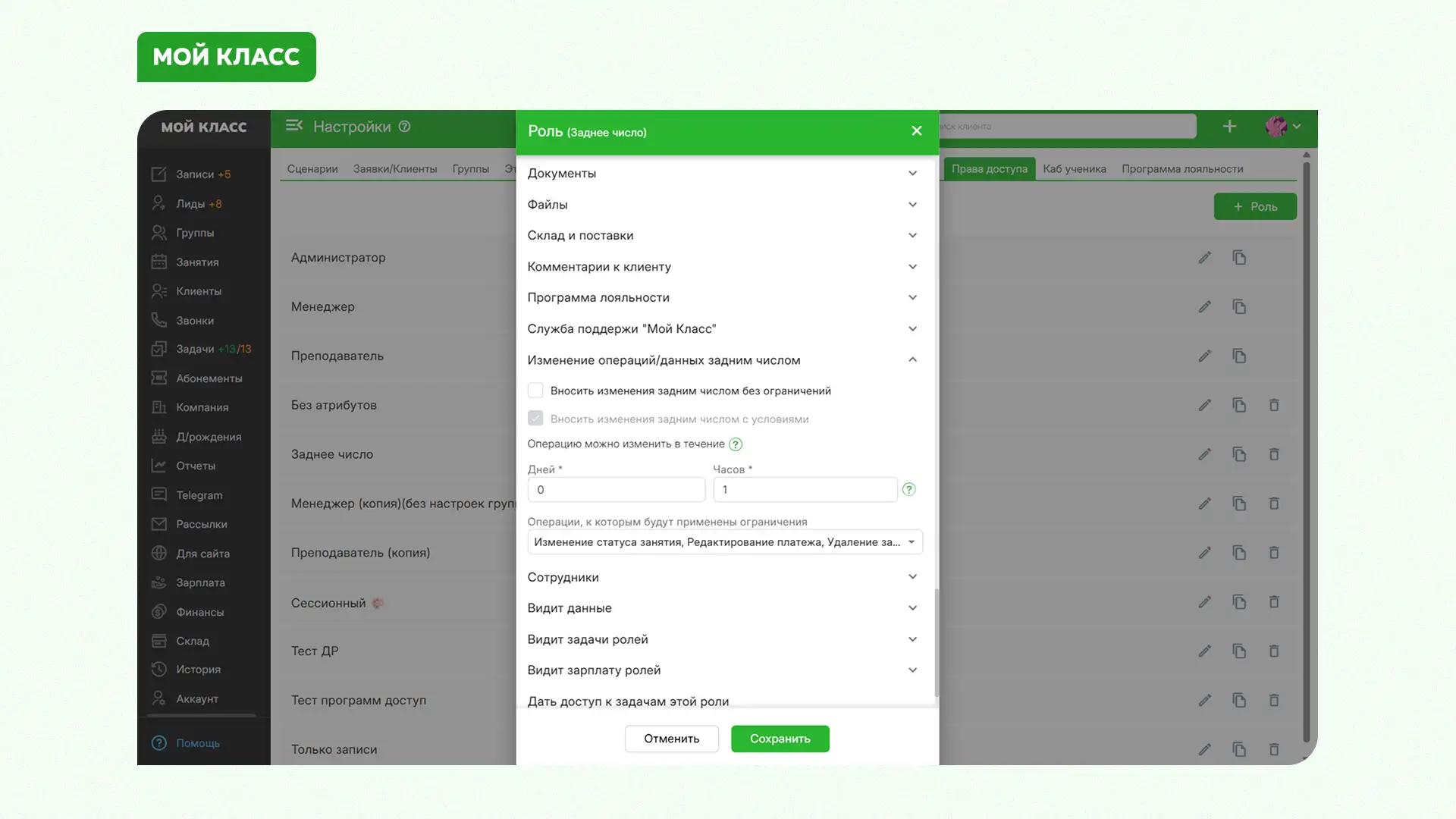 Теперь в настройках ролей можно ограничить возможность вносить изменения задним числом. Руководитель сам решает, кому это разрешено.