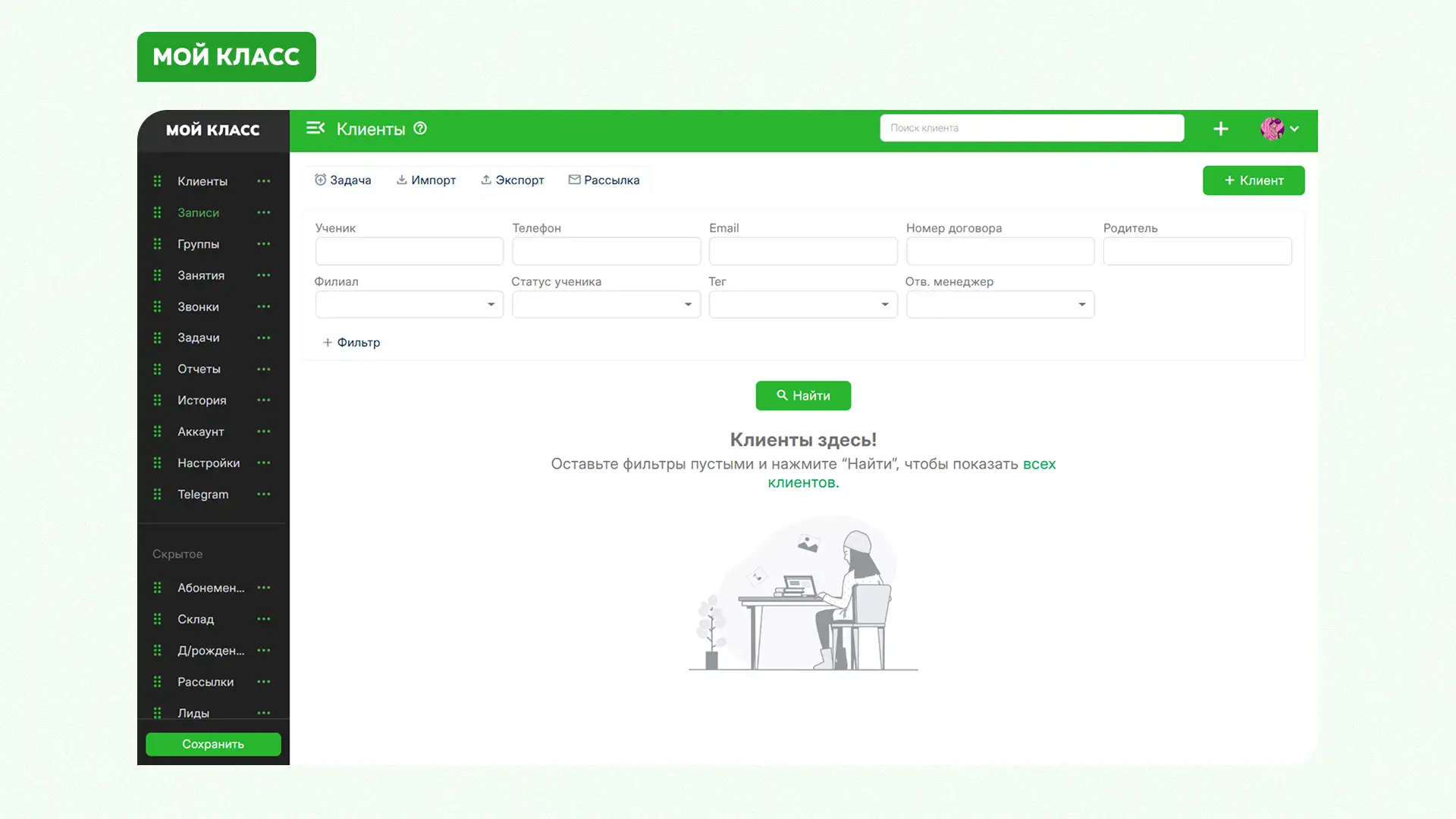 Теперь первое сообщение можно отправить прямо из карточки клиента, даже без предыдущего диалога и без имени пользователя. Это удобно для первичного контакта после заявки или пробного занятия.
