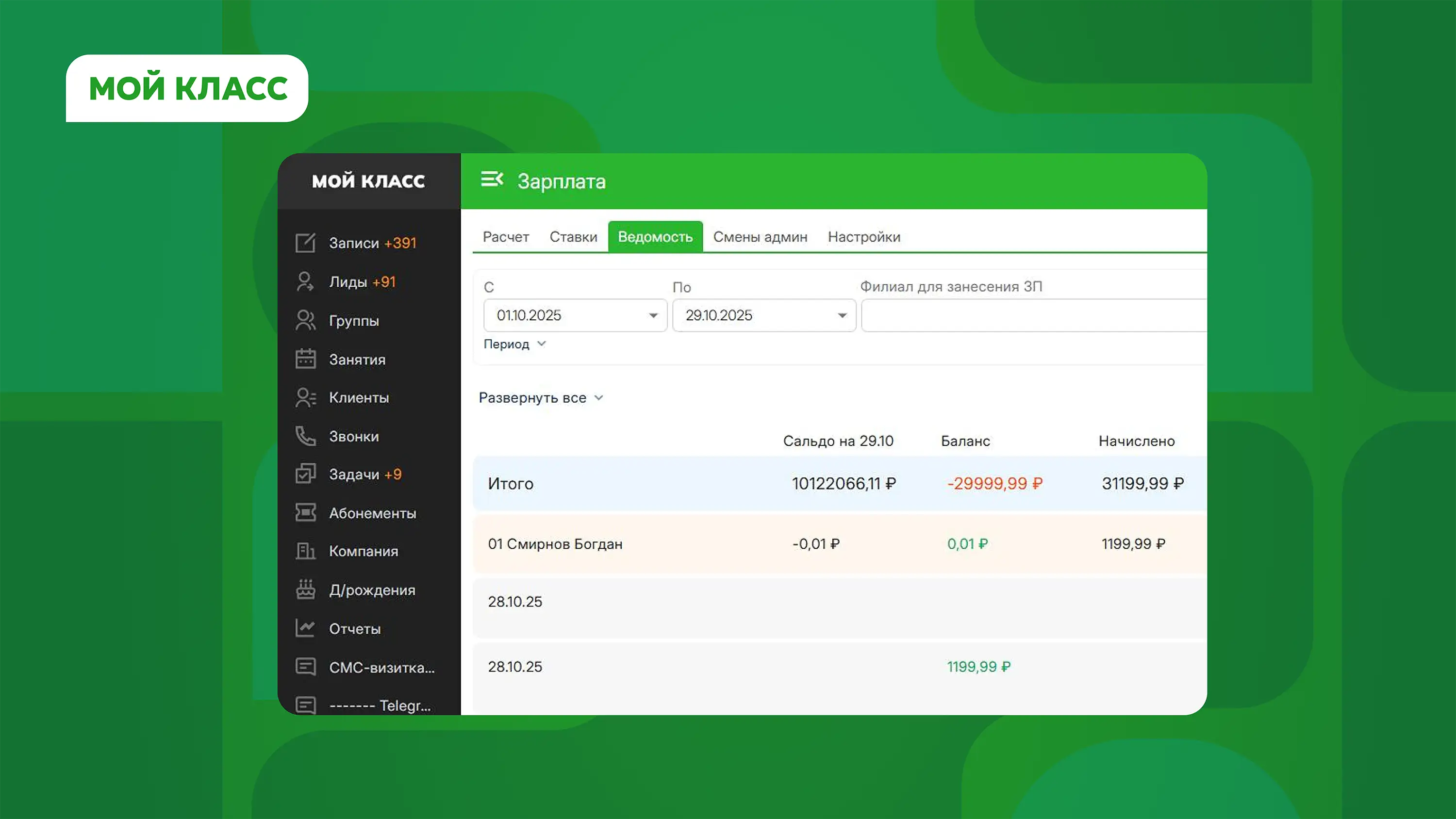 Теперь в ведомости показывается сальдо на конец периода — накопленный итог с начала учёта. Он рассчитывается автоматически как разница между всеми начислениями и всеми выплатами сотруднику за всё время работы. Это делает расчёты более прозрачными и снижает риск ошибок при сверках и бухгалтерском учёте.