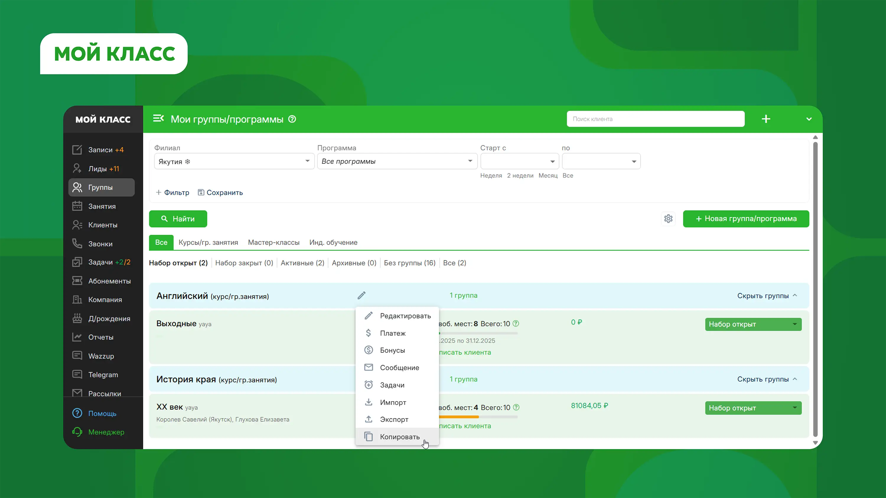 Теперь группу можно скопировать вместе со всеми её настройками. Переносятся все параметры группы, при этом ученики и записи не копируются — создаётся новая, «чистая» группа с готовыми настройками. Это особенно удобно для центров с типовыми программами и повторяющимися форматами занятий.