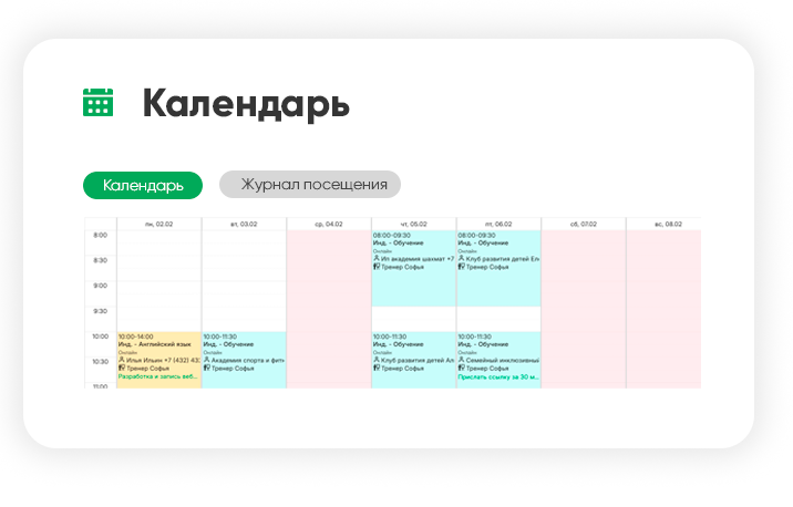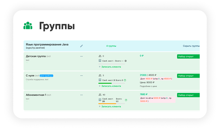 Мой Класс помогает планировать и корректировать расписание, распределять учеников по группам, учитывать абонементы и контролировать посещаемость. Все данные обновляются автоматически в одной системе и доступны всем сотрудникам в режиме реального времени.