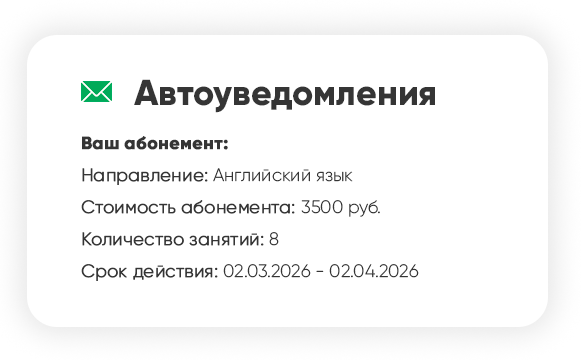 Личный кабинет и мобильное приложение предоставляют ученикам и родителям постоянный доступ к расписанию занятий, посещаемости, успеваемости и оплатам, а также позволяет получать push-уведомления об изменениях расписания, задолженностях и важных событиях образовательного центра.
